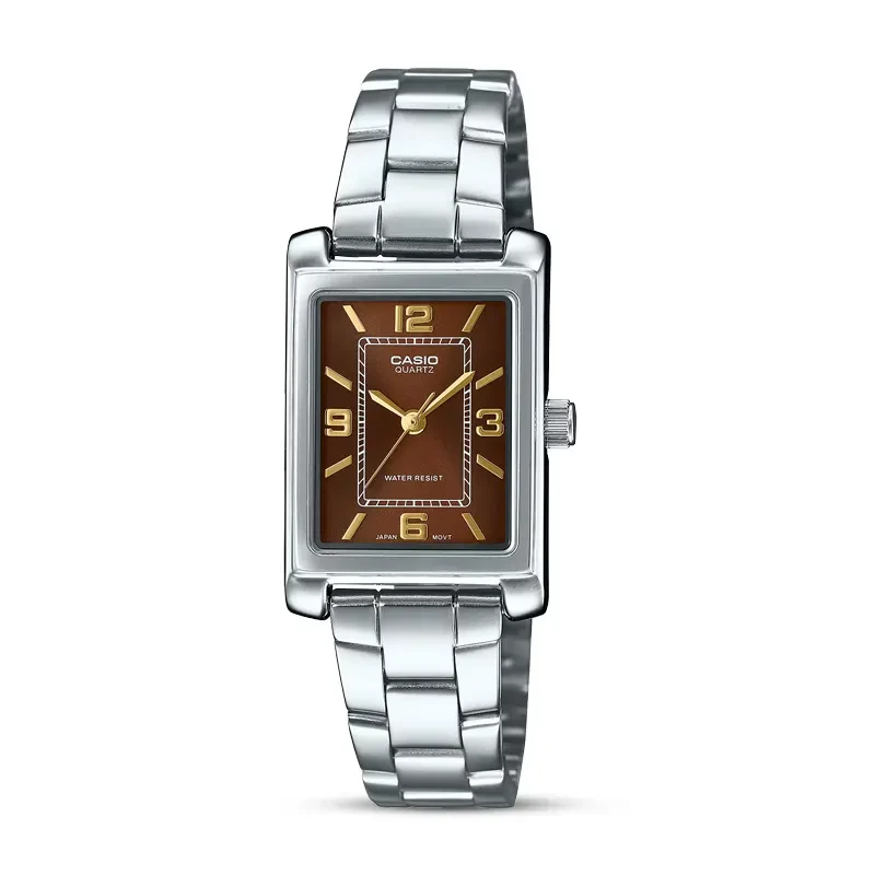 Elevate your look with the refined elegance of the Casio LTP-1234DD-5ADF. This stylish wristwatch features a striking chocolate brown dial accented with gold-tone hour markers and hands, all enclosed in a polished rectangular stainless steel case. The minimalist design, paired with a sturdy metal bracelet, makes it perfect for both everyday wear and special occasions. Powered by a reliable Japanese quartz movement and offering basic water resistance, this timepiece delivers timeless sophistication with a modern twist. Available at Watch Zone. UPC: 4549526383175
