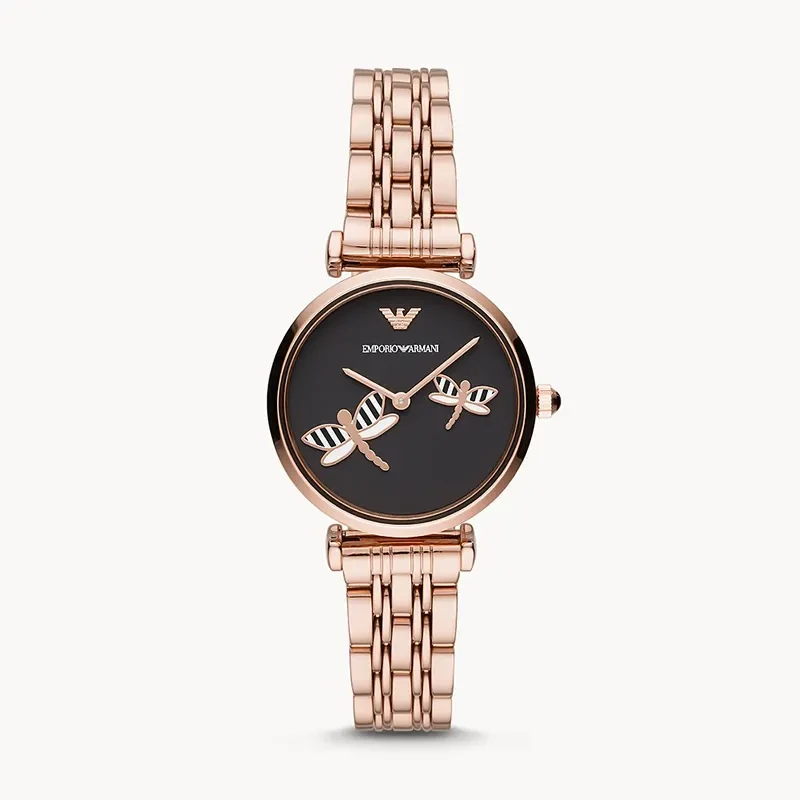 The Emporio Armani Gianni T-bar Black Dial Ladies Watch (Model: AR11206), available at Watch Zone BD, is a striking accessory that exudes sophistication and elegance. Designed with a 32mm round stainless steel case in a stunning rose gold-tone finish, this ladies’ watch features a sleek black dial that adds a bold contrast to its refined design. Powered by reliable Japan quartz movement, it offers precise hour and minute functions under a scratch-resistant mineral crystal. The rose gold-tone stainless steel bracelet, 14mm wide and secured with a deployment clasp, enhances its graceful appeal. A fixed bezel, pull/push crown, and solid case back contribute to its durable yet fashionable build. With a water resistance of up to 30 meters (100 feet) and a 2-year warranty, the AR11206 is a perfect blend of everyday functionality and stylish flair — exclusively at Watch Zone BD.
