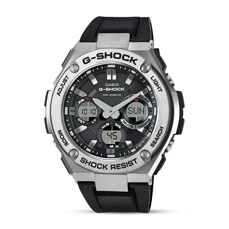 Brand: Casio G-Shock, Series: GST-S110 Series, Movement: Quartz, Model: GST-S110-1A, Gender: Men's, Case size: 52.4mm, Case Thickness: 16.1mm, Dial Color: Black, Case / Bezel material: Resin / Stainless steel, Band Material: Resin, Band Color: Black, Clasp: Tang, Construction: Shock Resistant, Power supply and battery life: Tough Solar (Solar powered), Bezel: Fixed., Bezel Color: Silver, Bezel Material: Stainless Steel, Glass: Mineral Glass, Weight: 108g, Water resistance: 200 Meters, Warranty: 2 Years