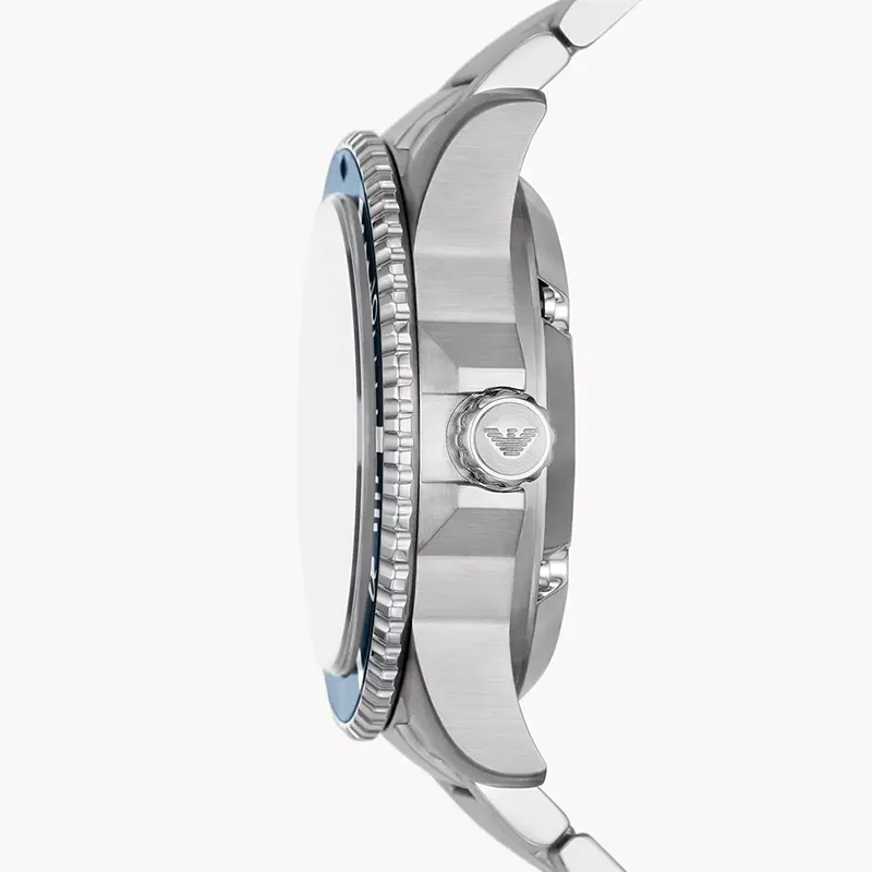 Brand: Emporio Armani, Series: Meccanico, Gender: Men’s, Model: AR60059, Movement: Automatic, Case Size: 42mm, Dial Color: Blue, Case Thickness: 13mm, Case Material: Stainless Steel, Case Shape: Round, Case Back: Transparent, Case Color: Silver, Band Material: Stainless Steel, Band Type: Bracelet, Band Color: Silver-tone, Band Width: 22mm, Clasp: Bracelet Deployant with Safety Release, Crystal: Scratch Resistant Mineral, Bezel: Fixed, Bezel Color: Blue, Bezel Material: Stainless Steel with Tachymeter, Crown: Pull / Push, Water Resistance: 100 Meters / 300 Feet, Functions: Hour, Minute, Second, Watch Style: Casual, Warranty: 2 Years