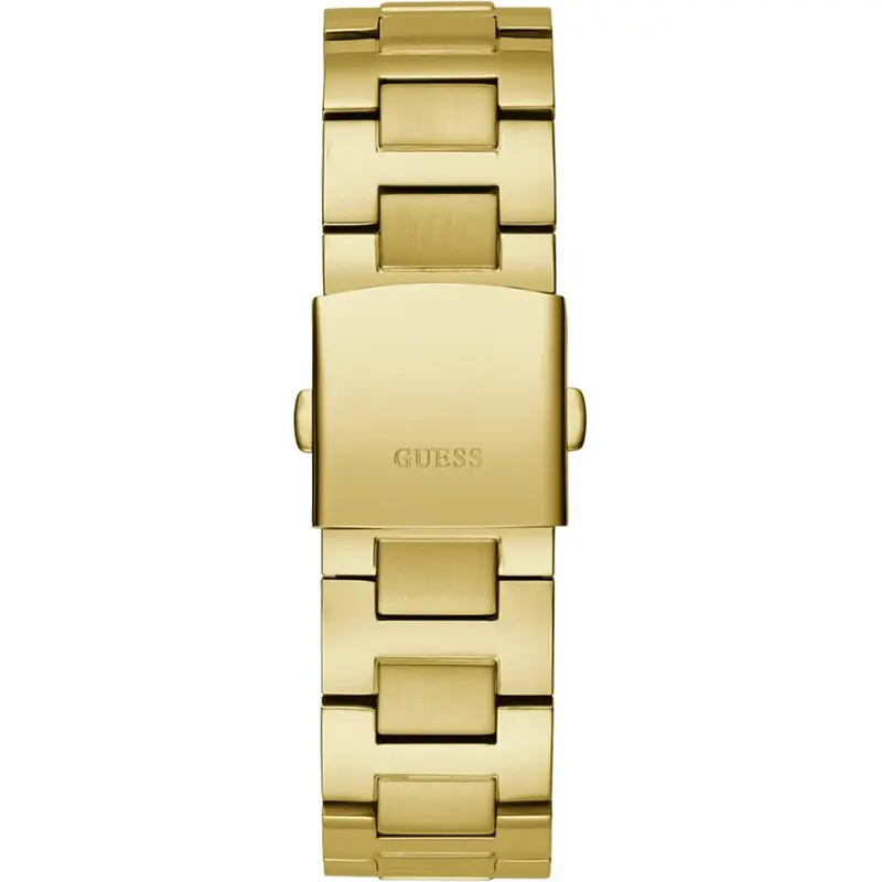 Brand: Guess, Series: Empire, Gender: Men’s, Model: GW0489G2, Movement: Quartz, Case Size: 46mm, Dial Color: Black, Case Thickness: 11.25mm, Case Material: Stainless Steel, Case Shape: Octagonal, Case Back: Solid, Band Material: Stainless Steel, Band Type: Bracelet, Band Color: Gold-tone, Band Width: 26mm, Clasp: Pilot Buckle, Crystal: Scratch Resistant Mineral, Bezel: Fixed, Bezel Color: Gold-tone, Bezel Material: Stainless Steel, Crown: Pull / Push, Water Resistant: 50 Meters / 165 Feet, Functions: Date, Day, Hour, Minute, Second, Watch Style: Fashion, Warranty: 2 Years