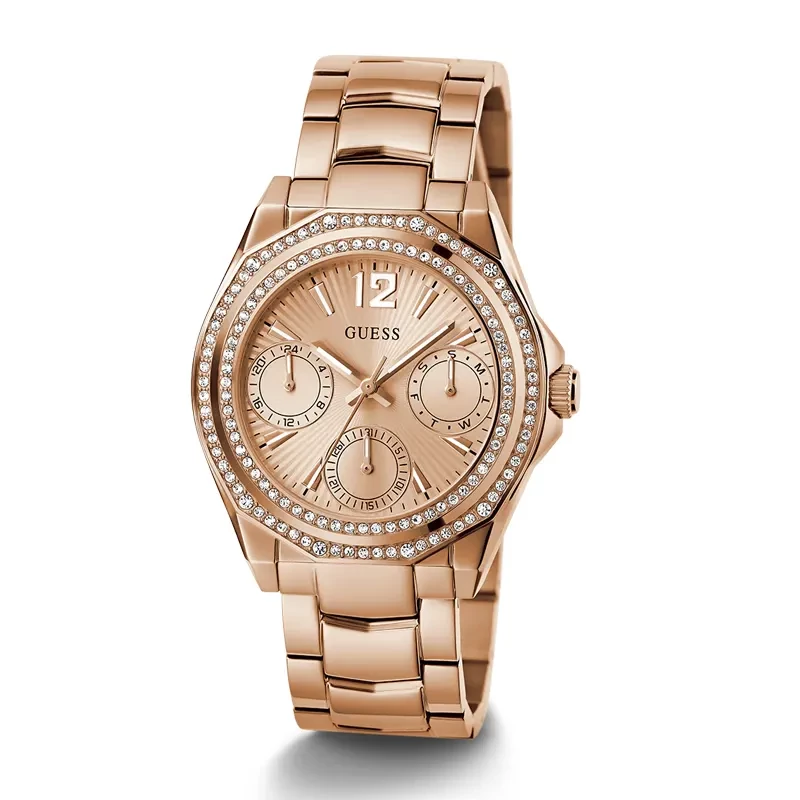 The Guess Ritzy Rose Gold-tone Rose Dial Ladies Watch (GW0685L3) is an elegant and fashion-forward timepiece, perfect for women who appreciate style with functionality. Featuring a 36mm Rose gold-tone stainless steel case with a solid case back, this watch offers a durable yet luxurious design. The Rose dial is beautifully complemented by a fixed Rose gold-tone bezel adorned with crystals, adding a touch of glamour to any outfit. Powered by Japanese quartz movement, it ensures accurate timekeeping with functions including date, day, 24-hour display, hour, minute, and second. The Rose gold-tone stainless steel bracelet, measuring 18mm in width, is secured with a fold-over clasp with push-button release, providing a comfortable and secure fit. With a water resistance of 50 meters (165 feet), this watch is suitable for everyday wear, offering protection against splashes and brief water exposure. Originating from the USA, the Guess Ritzy GW0685L3 comes with a 2-year warranty, making it a reliable and stylish accessory for any occasion. Backed by a 2-year Watch Zone warranty, this fashion watch is a perfect blend of functionality and style. UPC: 091661540448